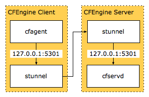 CFEngine clients pull data from servers. The pull model has various advantages over pushing out updates. Using SSH or TLS, the CFEngine client would connect to a port on the localhost interface, which would then be forwarded encrypted to the CFEngine server.