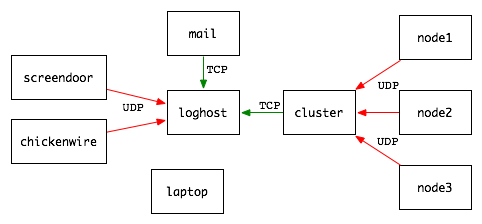 The following network overview diagram illustrates the various hosts discussed below. The central loghost accepts logs from various network devices: reliable TCP from the mail server and grid cluster master, and User Datagram Protocol (UDP) logs from the firewalls chickenwire and screendoor. Additionally, the cluster master grid proxies for a number of cluster nodes, which in turn log via UDP to grid. A stand alone laptop configuration is also covered.